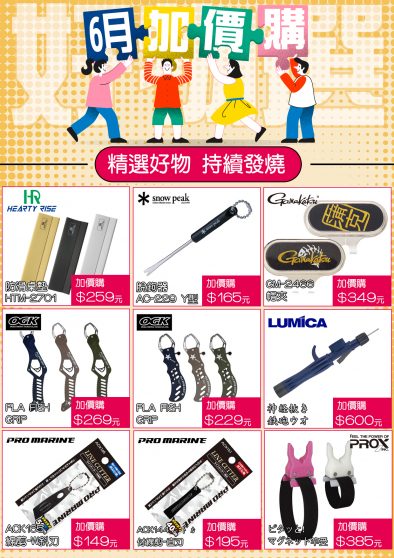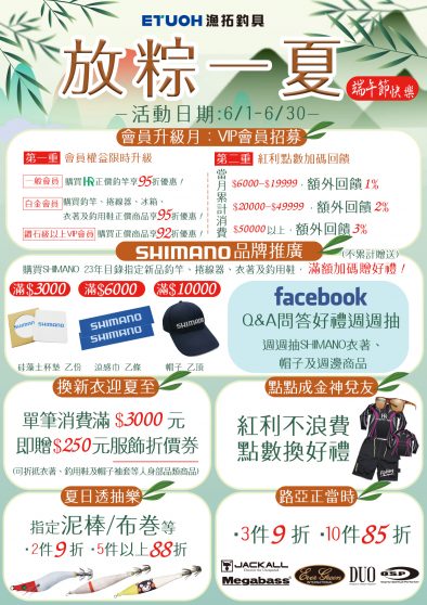 漁拓6月份活動來囉 升級您的會員 有多項優惠喲 會員升級月:VIP會員招募 第一重會員權益限時升級:等級越高優惠越多喲! 第二重紅利點數加碼回饋:累積消費都有紅利點數加碼回饋! ——————————————– 6月SHIMANO品牌月 購買SHIMANO 23年目錄指定新品釣竿、捲線器、衣著及釣用 鞋,滿額加碼贈好禮三選一,數量有限送完為止! FACEBOOK Q&A問答好禮週週抽 週週抽SHIMANO衣著、帽子及週邊商品 ——————————————- 換新衣迎夏至 單筆結帳金額滿$3,000,即贈250元服飾折價券乙張! 想換季就是現在 ——————————————– 點點成金神兌友 紅利不浪費 點數換好禮拿您的紅利換您喜歡的東西喲 ——————————————– 夏日透抽樂 釣透抽吃透抽這就是夏日!指定泥棒、布卷等2件9折、5件以上88折! ——————————————– 路亞正當時 OSP、JACKALL、EVERGREEN、MEGABASS、DUO─ 3件9折,10件85折 ——————————————–...
