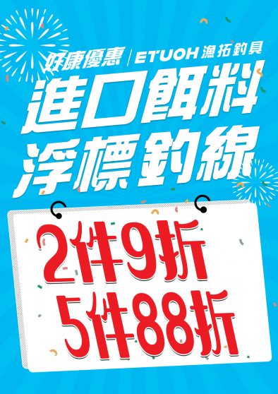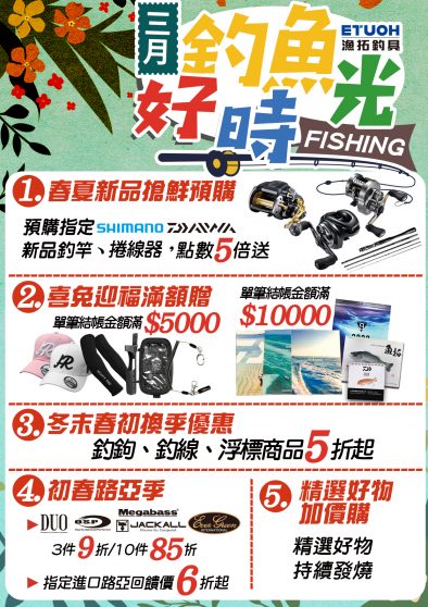 3月釣魚好時光 3份漁拓優惠活動來囉~ 1.春夏新品搶鮮預購 預購DAIWA & SHIMANO指定新品釣竿、捲線器,點數5倍送。 2.喜兔迎福滿額贈 單筆結帳金額滿$5,000元 單筆結帳金額滿$10,000元 都有精選好禮送給您~ 3.冬末春初換季優惠 釣鉤、釣線、浮標商品5折起。 4.初春路亞季 指定進口路亞回饋價6折起 OSP、JACKALL、EVERGREEN、MEGABASS、DUO─3件9折,10件85折。 5.進口餌料、浮標、釣線好康優惠 2件9折、5件88折 #3月 #漁拓 #優惠 #DAIWA #SHIMANO #點數5倍送 #滿額贈 #換季優惠 #OSP #JACKALL #EVERGREEN #MEGABASS #DUO...