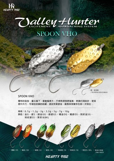 【商品介紹】HR VALLEY HUNTER 溪谷獵人 SPOON VHO 湯匙/亮片 獨特的造型,重心偏下,擺動幅度大,不規則漂落更擬真。表面凹洞設計,使其提升升力,可增加投擲的距離,遠投效果更佳。動態與視覺存在感一次到位。 規格(g):0.7g、1.2g、2g、3.5g、5g、7g、10g 顏色(color):金G、銀S、綠金GG、綠銀GS、橘金OG、橘銀OS、斑紋金SG、斑紋銀SS、黑夜光BKL HR VALLEY HUNTER 溪谷獵人 SPOON VHO 湯匙/亮片: https://www.heartyrise.cn/product/valley-hunter-spoon-vho/ #HR #HEARTYRISE #VALLEYHUNTER #溪谷獵人 #SPOON #VHO #湯匙 #亮片 #硬餌 #路亞 #表面凹洞設計 #升力提升 #增加投擲距離 #遠投 #路亞釣 #特殊造型 #誘魚 #釣魚