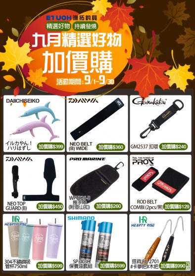 🎉10月歡慶雙十 釣魚趣🎉—–活動日期:10/1-10/31——📣滿額有禮慶雙十 活動日期:10/1-10/10 單筆結帳金額滿$4,999元 單筆結帳金額滿$9,999元 都有好禮送給您!! 📣JACKALL品牌月 ACKALL雙周抽 購買JACKALL商品滿1000元即可獲得抽獎券一張。 最大獎22年BPM釣竿 👉第一次抽獎期間:10/1-10/16,10/24 FB公開抽獎 👉第二次抽獎期間:10/17-10/31,11/9 FB公開抽獎 OSP、JACKALL、EVERGREEN、MEGABASS、DUO─3件9折,10件85折。 📣秋冬新品搶鮮預購 預購DAIWA、SHIMANO指定釣竿、捲線器,點數5倍送。 📣夏去秋來換季特賣 精選商品6折起 📣進口餌料、浮標、釣線好康優惠 2件9折、5件88折 #10月 #活動 #釣魚趣 #雙十國慶 #滿額贈 #JACKALL #抽獎 #點數5倍送 #OSP...