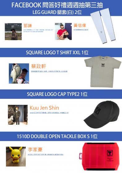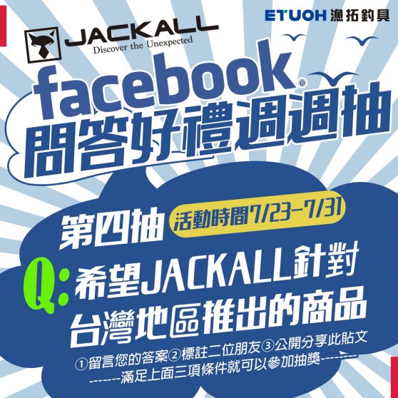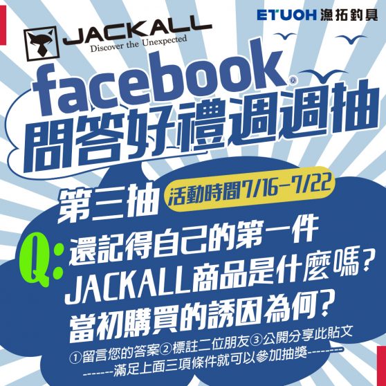 🎊JACKALL 好禮第三抽🎊 Q:還記得自己的第一件 JACKALL商品是什麼嗎?當初購買的誘因為何? 📌留言您的答案 📌並標註二位朋友 📌且公開分享此貼文 ——-滿足上面三項條件就可以參加抽獎——– 活動期間:7/16-7/22 多樣JACKALL商品送給您,有參加就有機會! 備註: 1.不符合活動辦法規定或回答不相關者,即喪失抽獎資格,主辦單位將不另行網路公告。 2.活動抽出中獎者後將公布於漁拓企業臉書粉絲專頁 ,中獎者請於規定內私訊回覆收件資料,逾期即視該中獎者自願放棄。 3.中獎贈品恕不指定顏色款式及號數規格,隨機出貨。 4.主辦單位保有隨時修改及終止本活動之權利,如有任何變更內容或詳細注意事項將公布於本網頁, 恕不另行通知。