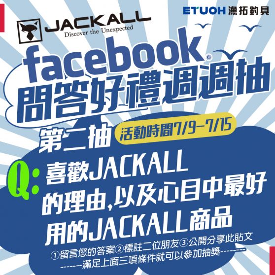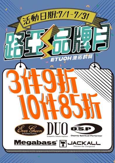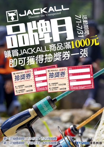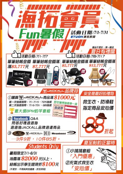 漁拓7月放暑假囉 夏日有禮讚滿額贈 7/1-7/7單筆結帳滿$3777/滿$7777 7/8-7/17單筆結帳滿$5777/滿$12777 都有好禮送給您 JACKALL品牌月 ①購買JACKALL商品滿1000元即可獲得抽獎券一張 ②FACEBOOK Q&A問答好禮週週抽 ③OSP、JACKALL、EVERGREEN、MEGABASS、DUO─3件9折,10件85折。 釣魚安全不可少~救生衣、防滑鞋指定商品安心價折起 Students Only 暑假限定~消費滿元以上,結帳出示學生證現折元! 夏夜就是要出船釣魚 ①小搞搞套組入門優惠 ②充氣式救生衣安心價 #7月 #漁拓 #放暑假 #滿額贈 #夏日 #JACKALL #品牌月 #FB抽獎 #抽獎券 #釣魚安全 #救生衣 #防滑鞋 #安心價...