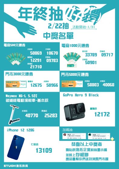 摸彩券先不要丟,4/22 下午2點還有加碼抽獎喔 最大獎有 Gogoro VIVA MIX 漁拓加碼升級最新款 年終抽好禮禮券只發到3月底喔 快把握最後機會 注意 2/22的中獎者注意,獎品只保留到3月底喔 請中獎者私訊”漁拓企業”小編 並附上存根聯與聯絡電話 獎品會寄至購物門市 2/22未領獎名單 電商500元禮券:50869、12291、21710 電商1000元禮券:09717 門市3000元禮券:12675 GoPro Hero 9 Black:12172 快快來領獎,不然小編要私吞啦 #GogoroVIVAMIX #年終抽好禮 #活動只到3月底