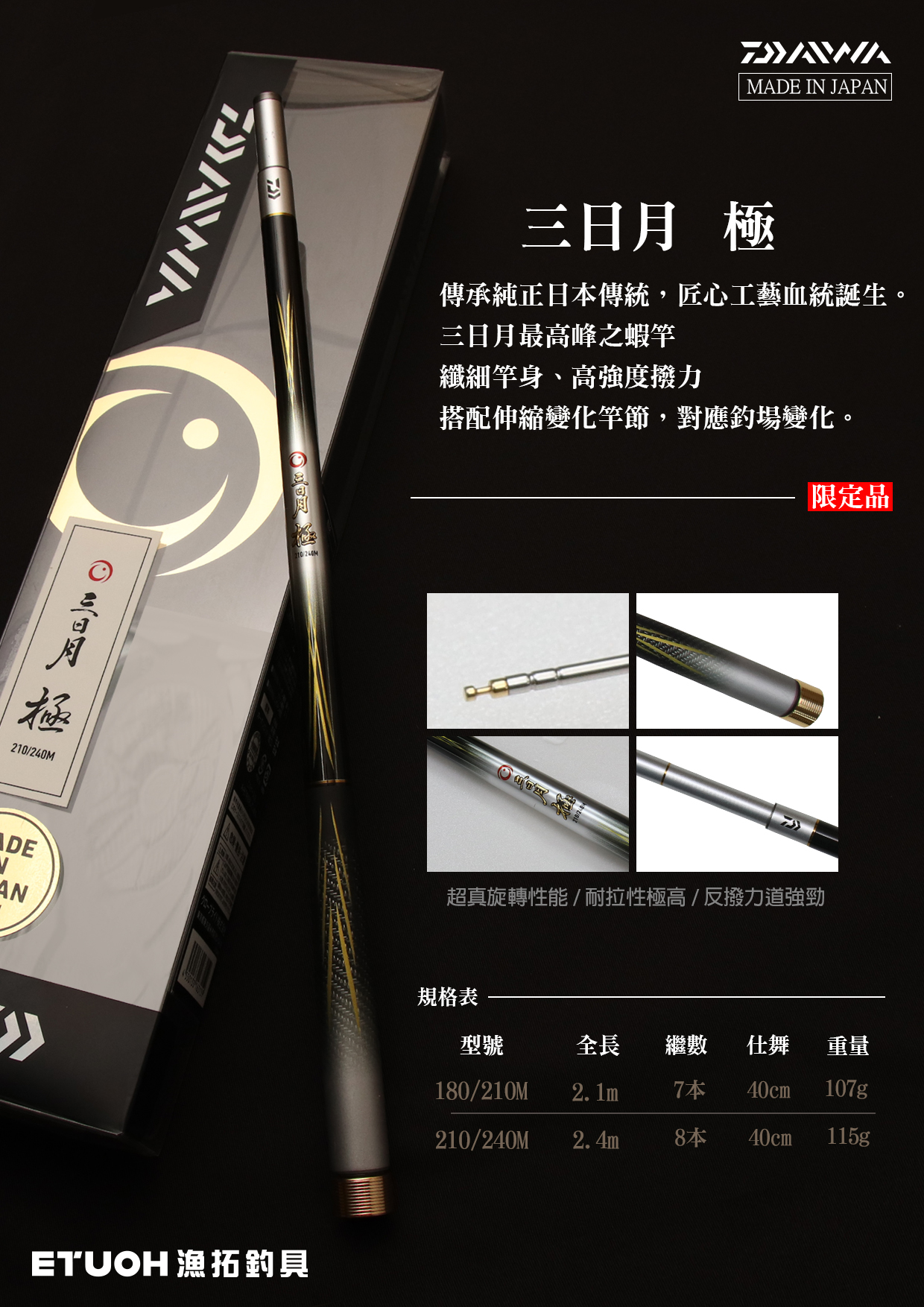 三日月最高峰之蝦竿 纖細竿身、高強度撥力 搭配伸縮變化竿節,對應釣場變化。