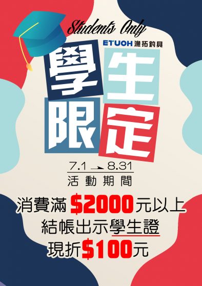 放暑假來釣魚 活動時間:7/1-8/31 暑假學生限定! 消費滿$2000以上 出示學生證,現折$100!! #學生限定 #學生證 #現折