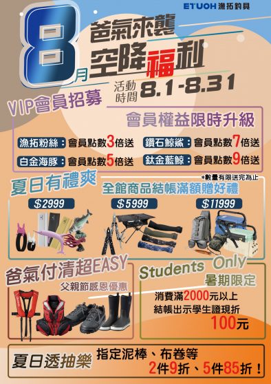 月爸氣來襲福利來襲 活動日期:➑/➊-➑/➌➊ ①.會員升級月:VIP會員招募 會員權益限時升級 漁拓粉絲:會員點數3倍送! 白金海豚:會員點數5倍送! 鑽石鯨鯊:會員點數7倍送! 鈦金藍鯨:會員點數9倍送! ⇀⇀⇀⇀⇀⇀⇀⇀⇀⇀⇀⇀⇀⇀⇀ ②.夏日有禮爽 全館商品結帳滿額贈好禮 單筆結帳金額滿$2,999元/$5,999元/$11,999元 都有好禮送給您~ ⇀⇀⇀⇀⇀⇀⇀⇀⇀⇀⇀⇀⇀⇀⇀ ③.煥然衣新 單筆結帳金額滿2,000元,即贈150元服飾折價券乙張! ●使用期限7/1~9/8 ●限下筆消費使用 ⇀⇀⇀⇀⇀⇀⇀⇀⇀⇀⇀⇀⇀⇀⇀ ④.爸氣付清超EASY 多樣商品超多折扣,都在父親節感恩優惠 ⇀⇀⇀⇀⇀⇀⇀⇀⇀⇀⇀⇀⇀⇀⇀ ⑤.Students Only 暑期限定,消費滿2000元以上,結帳出示學生證現折100元 ⇀⇀⇀⇀⇀⇀⇀⇀⇀⇀⇀⇀⇀⇀⇀ ⑥.夏日透抽樂 指定泥棒、布卷等2件9折、5件85折! #8月 #父親節...