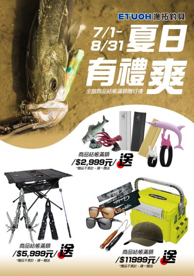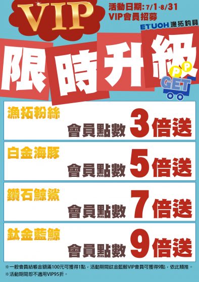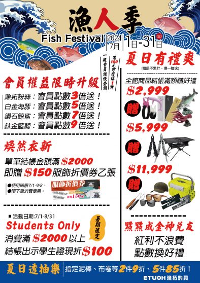 【7月漁人季好康都在這】 活動日期:7/1-7/31 𝟭.會員升級月:VIP會員招募 漁拓粉絲:會員點數3倍送! 白金海豚:會員點數5倍送! 鑽石鯨鯊:會員點數7倍送! 鈦金藍鯨:會員點數9倍送!會員好康趁現在!! ——————————— 𝟮.夏日有禮爽 全館商品結帳滿額贈好禮 滿$2,999元/滿$5,999元/滿$11,999元 都有好禮送給您!! ——————————— 𝟯.煥然衣新 單筆結帳金額滿2,000元,即贈150元服飾折價券乙張! ●使用期限7/1~9/8 ●限下筆消費使用 ——————————– 𝟰.Students Only 暑期限定,消費滿2000元以上,結帳出示學生證現折100元 ——————————– 𝟱.夏日透抽樂 指定泥棒、布卷等2件9折、5件85折! #7月 #漁人季 #會員升級 #VIP升級 #點數翻倍送 #夏日有禮...